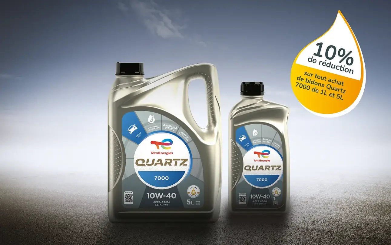 Alimentez votre moteur avec le très performant Quartz 7000. Profitez d'une remise de 10 % sur tous les achats de bidons Quartz 7000 de 1litre et 5 litres, et ce jusqu'au 31 octobre 2023.
