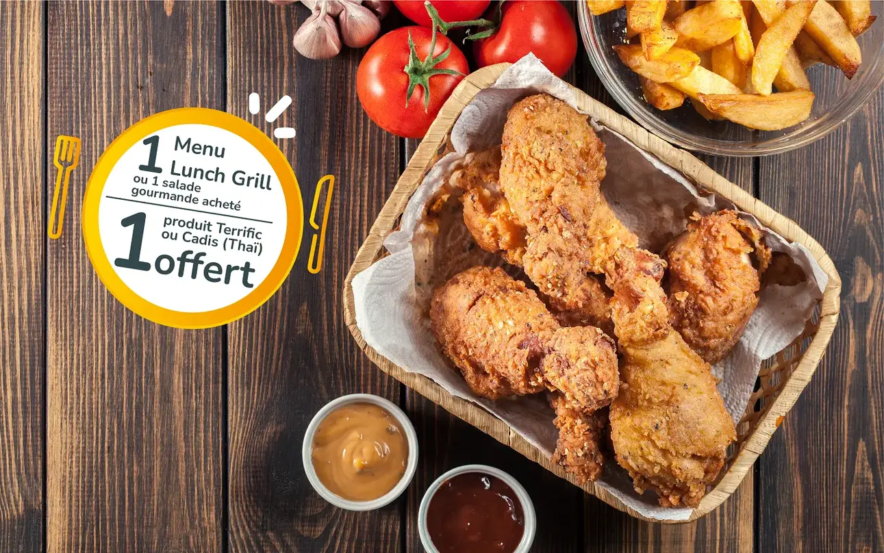 Pour tout achat de notre menu Lunch grill ou d'une salade gourmande, nous avons le plaisir de vous offrir 1 Terrific Coffee ou 1 produit Cadis.