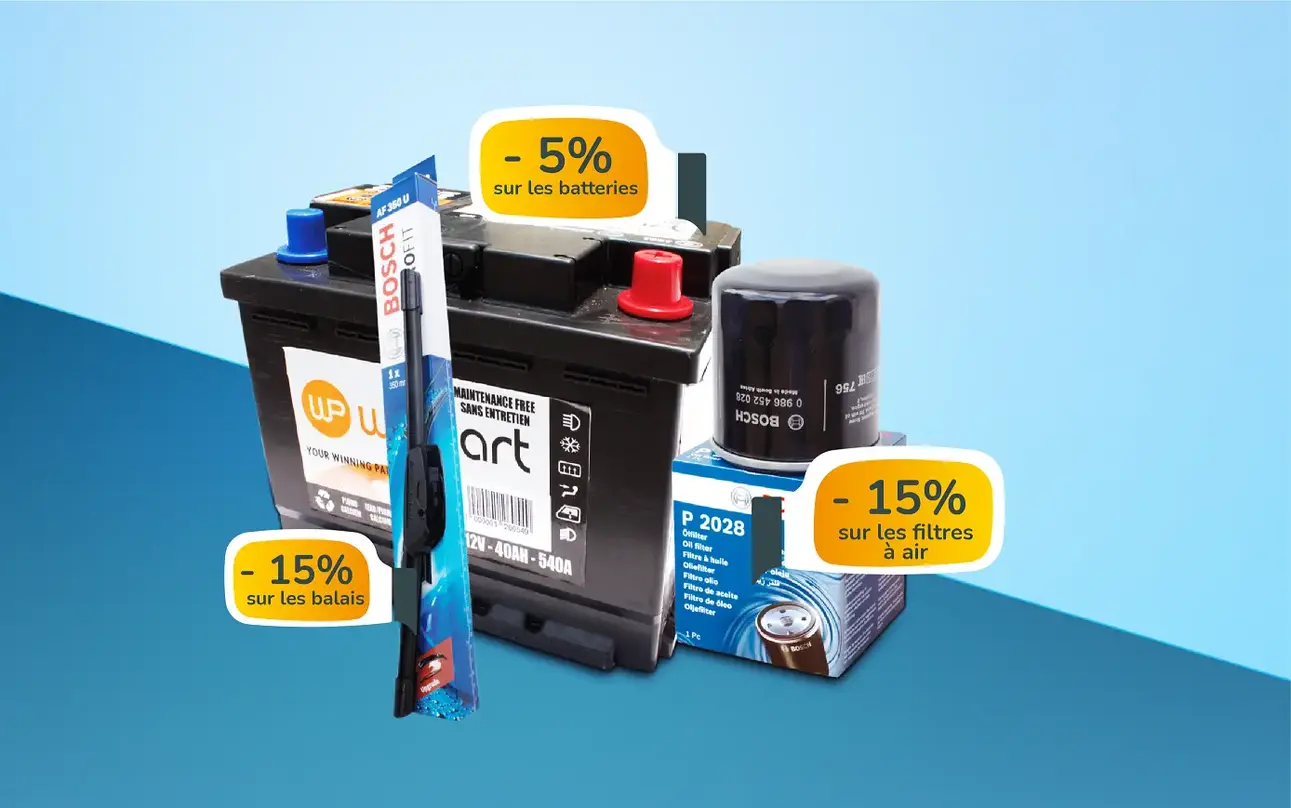 Chez Autofast, bénéficiez d'une remise de 15 % sur les essuie-glaces et les filtres à air, et d'une remise de 5 % sur les batteries.