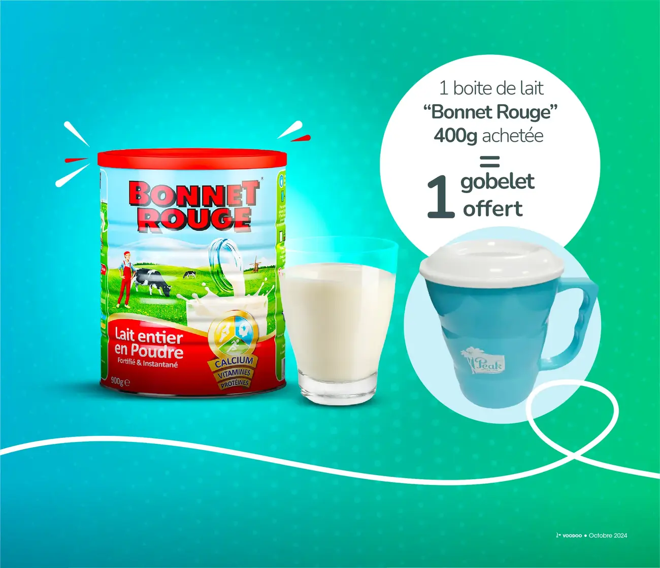 Achetez une boîte de Lait “Bonnet Rouge” 400g et recevez 1 gobelet gratuit.
