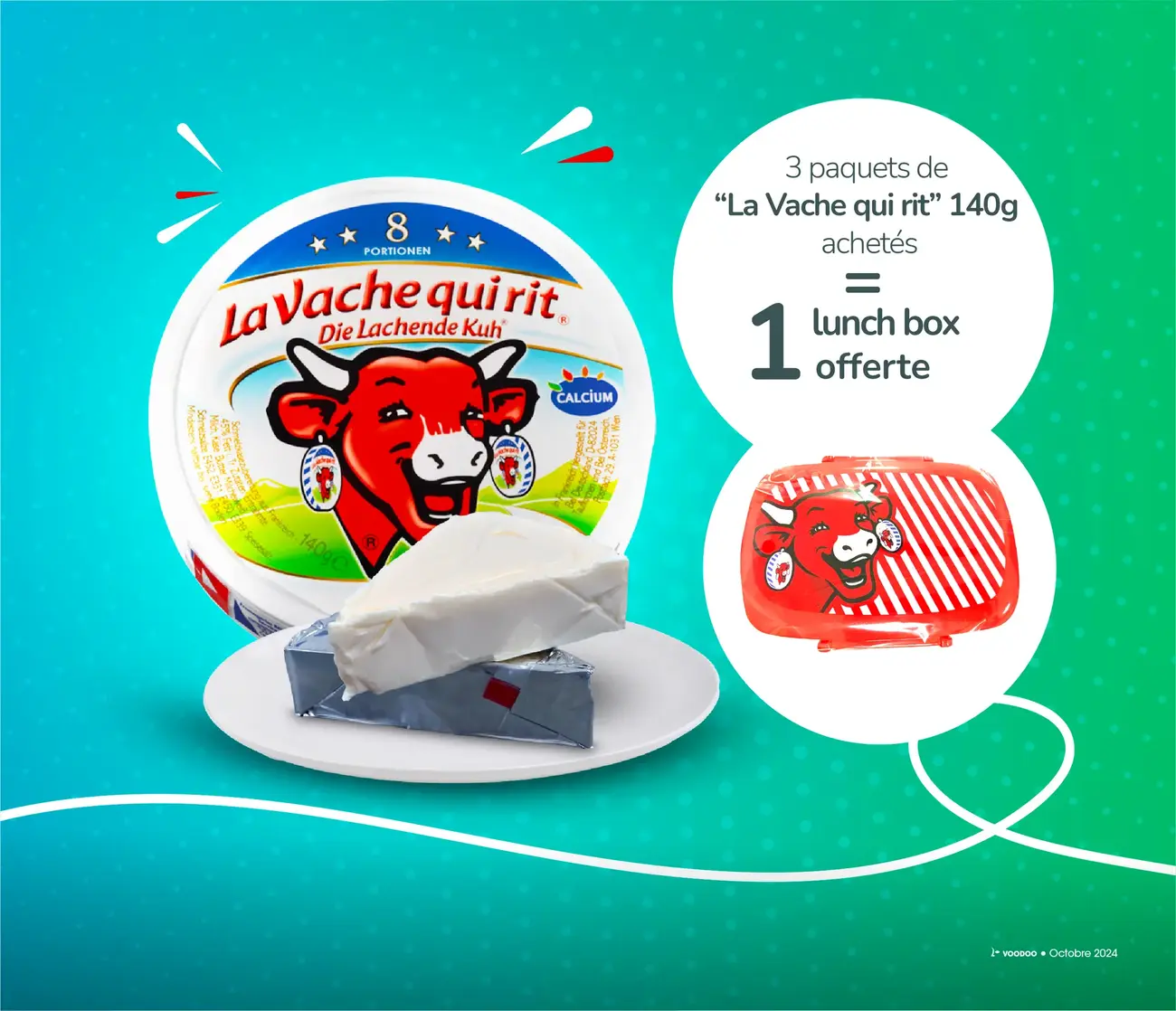 A l’achat* de 3 paquets de “La vache qui rit” 140g, une lunch box est offerte.